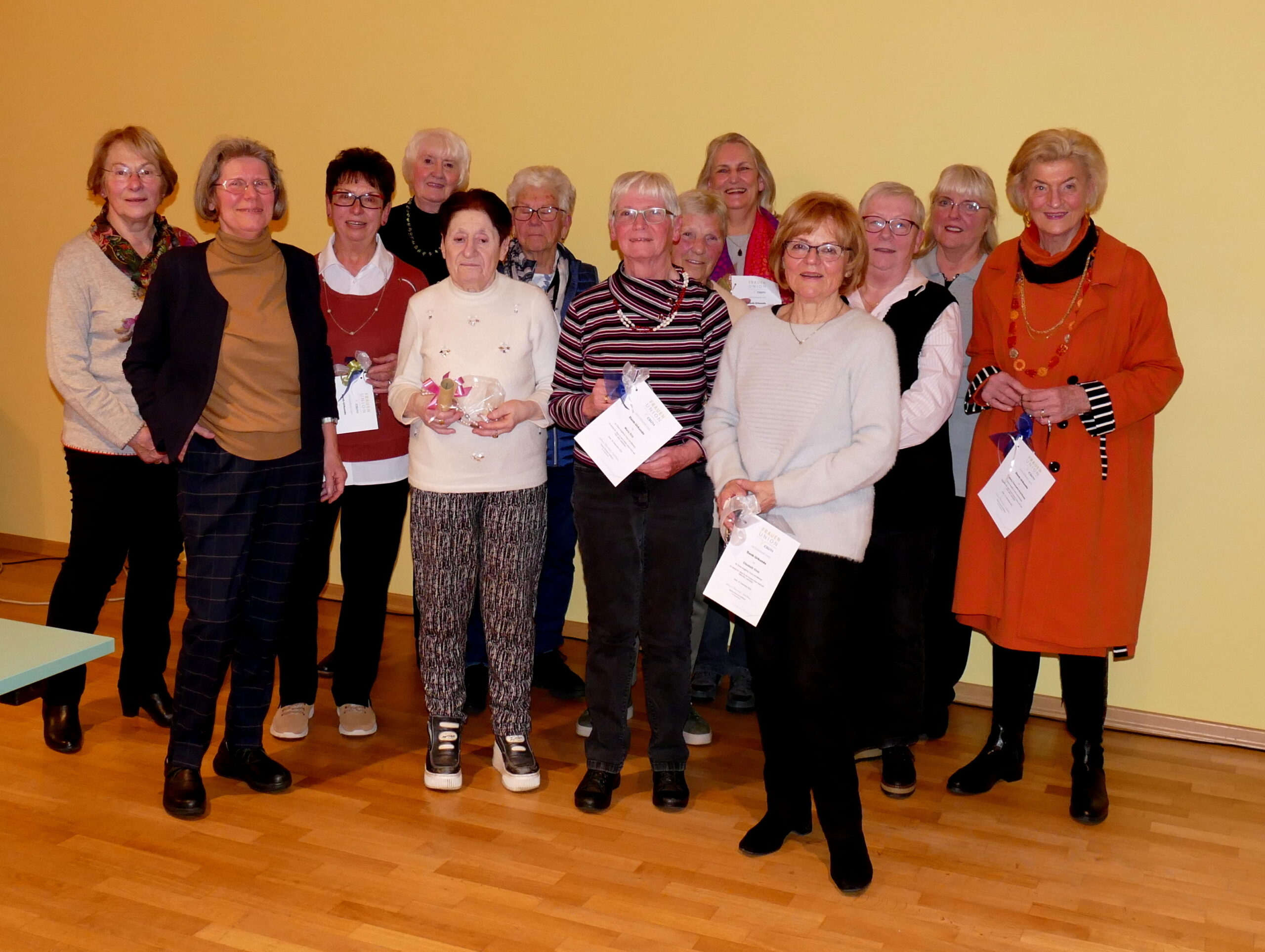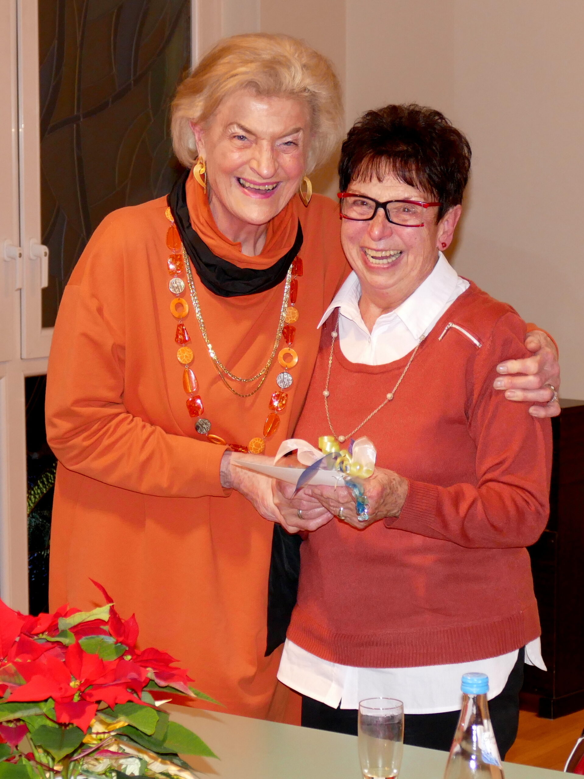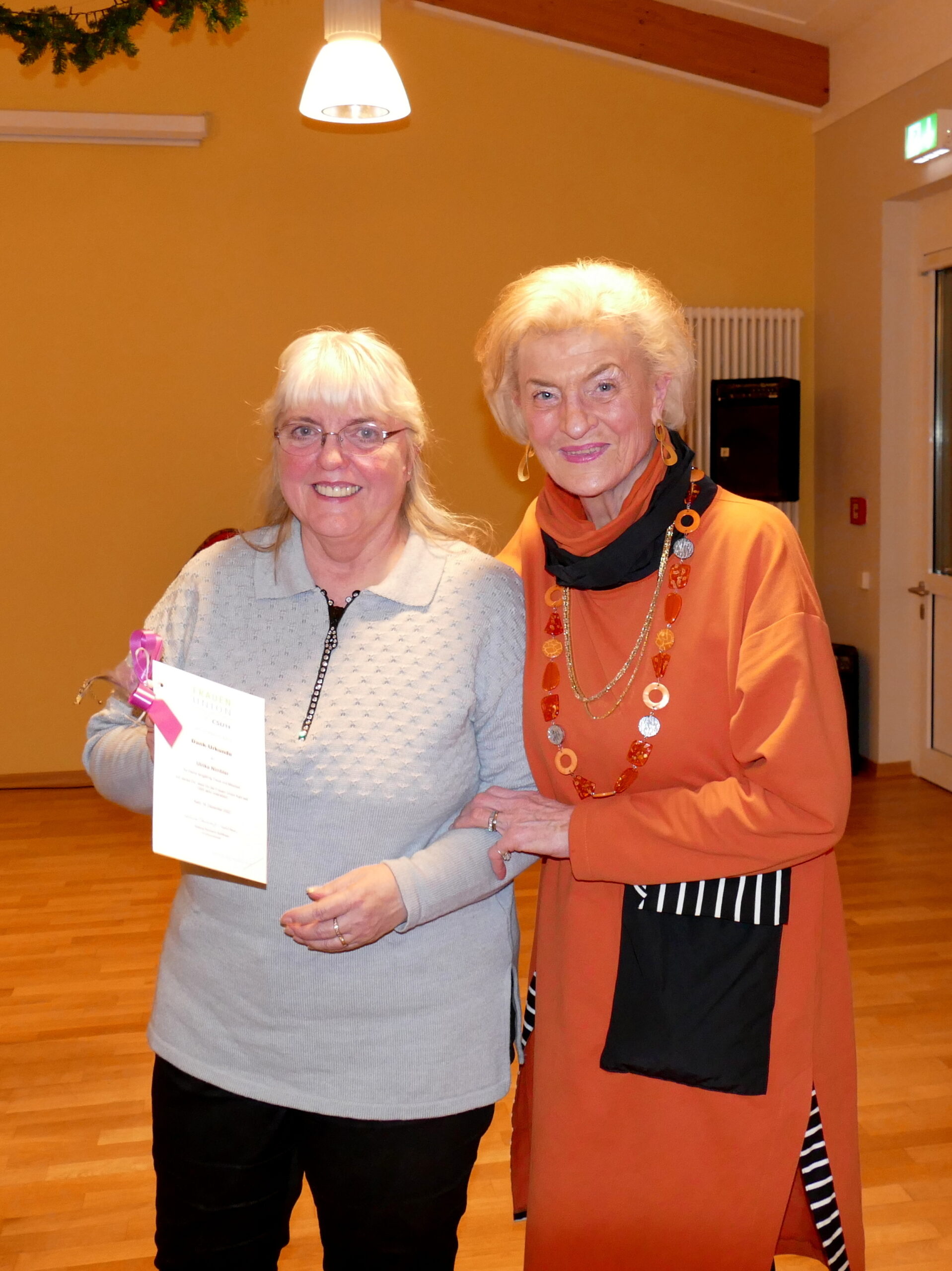 Anschließend fanden Ehrungen für jahrzehntelange Treue und Mitarbeit statt. Dazu gab es jeweils ein kleines modisches Geschenk. Als Gründungsmitglied wurde Reinholde Stenger mit einer Dankurkunde gewürdigt und auch die Vorsitzende selbst konnte auf 20-jährige Mitgliedschaft zurückblicken; die 2. Vorsitzende Erika Hein überreichte die Urkunde und ein Geschenk.