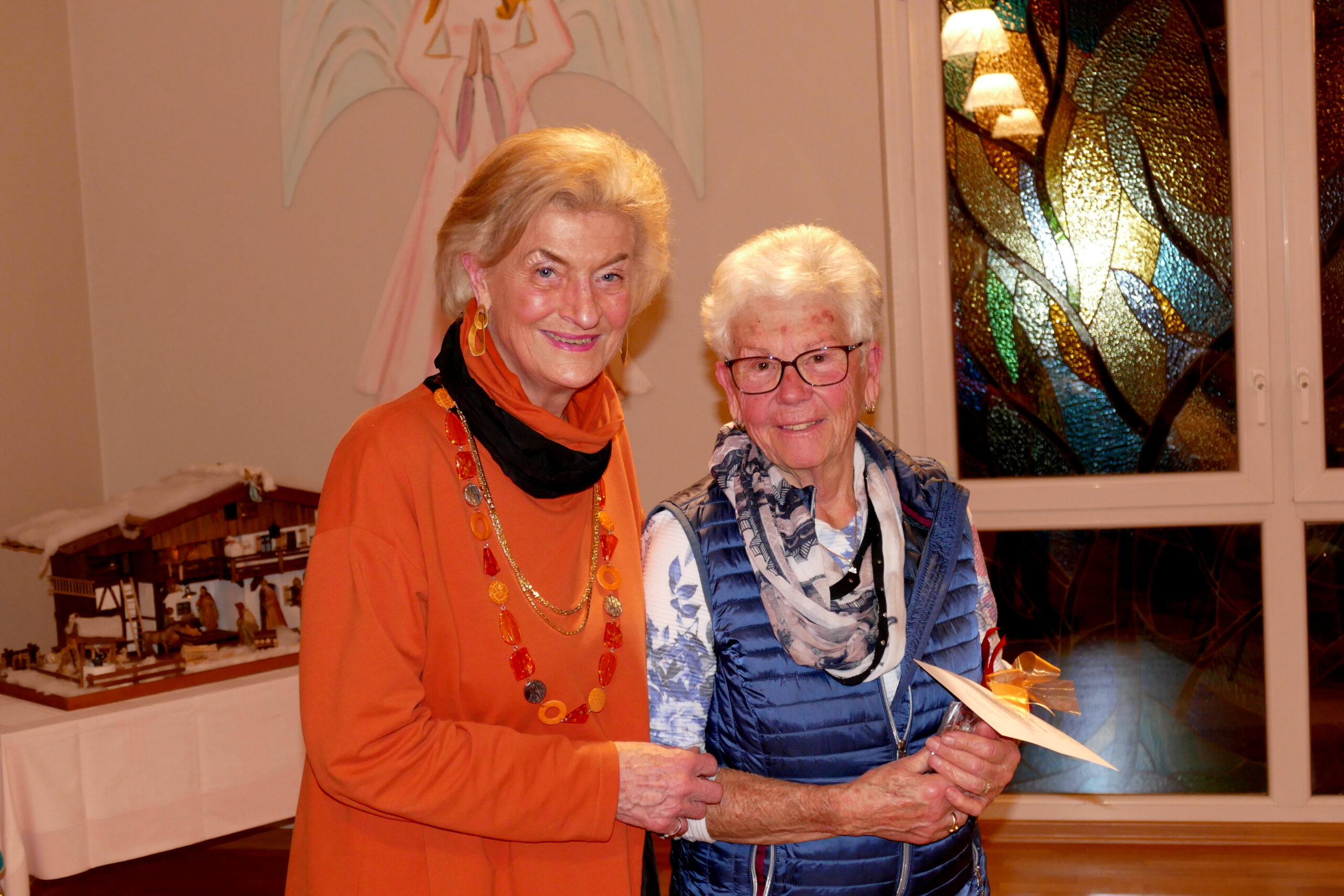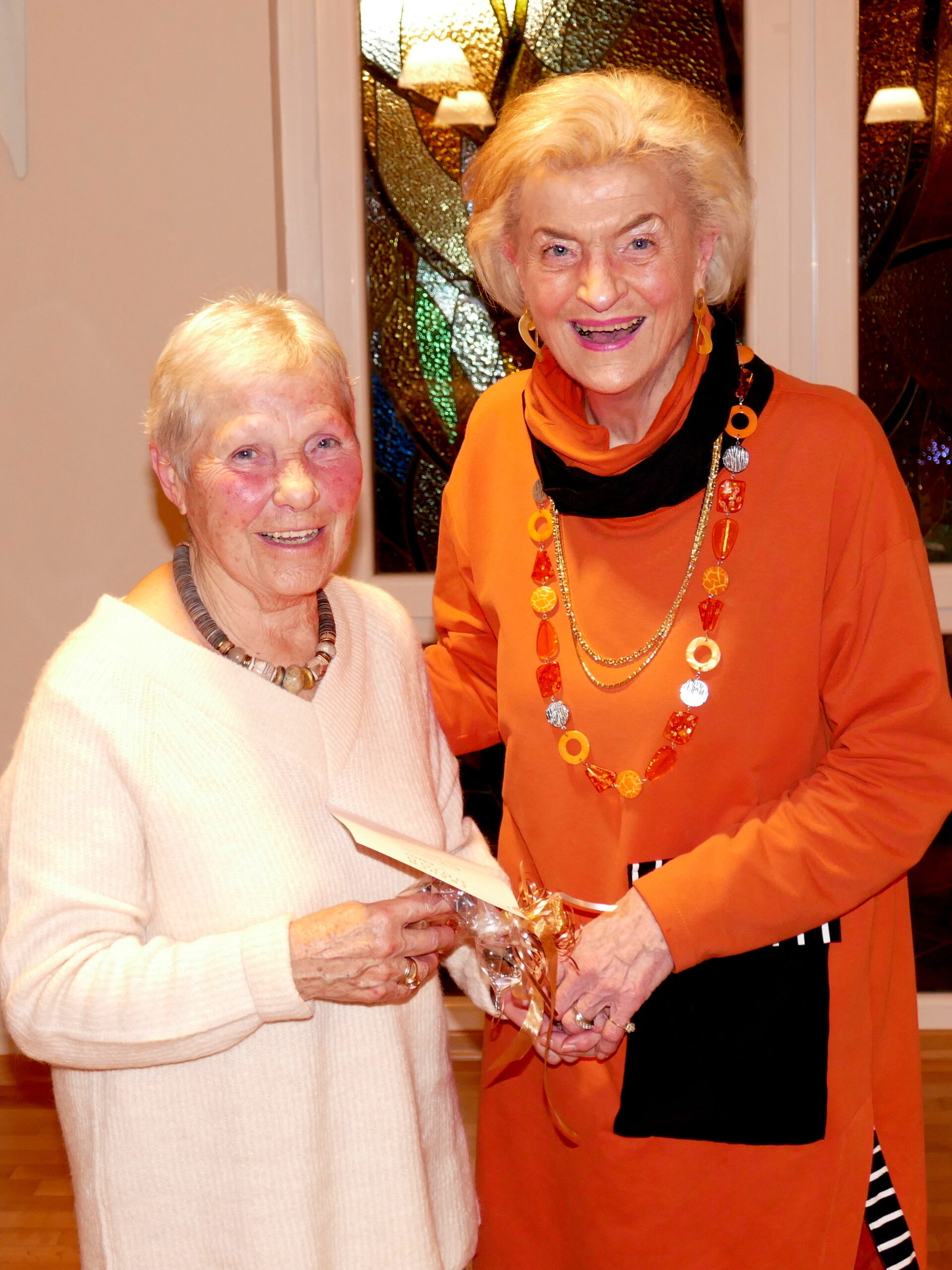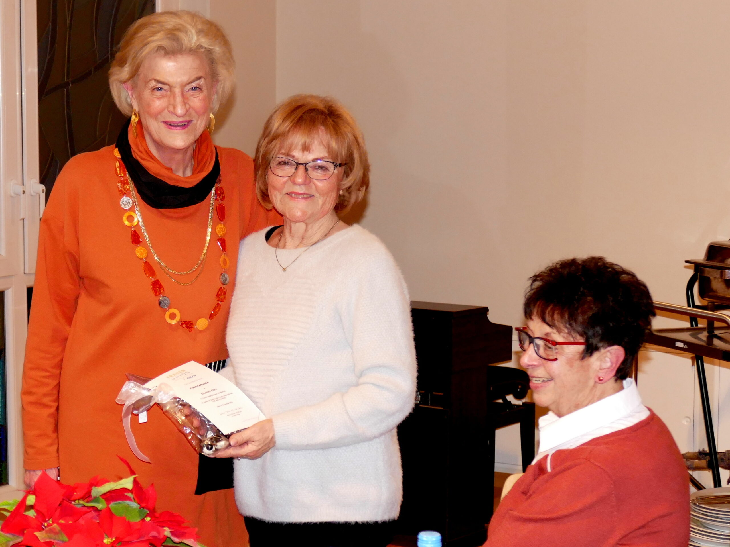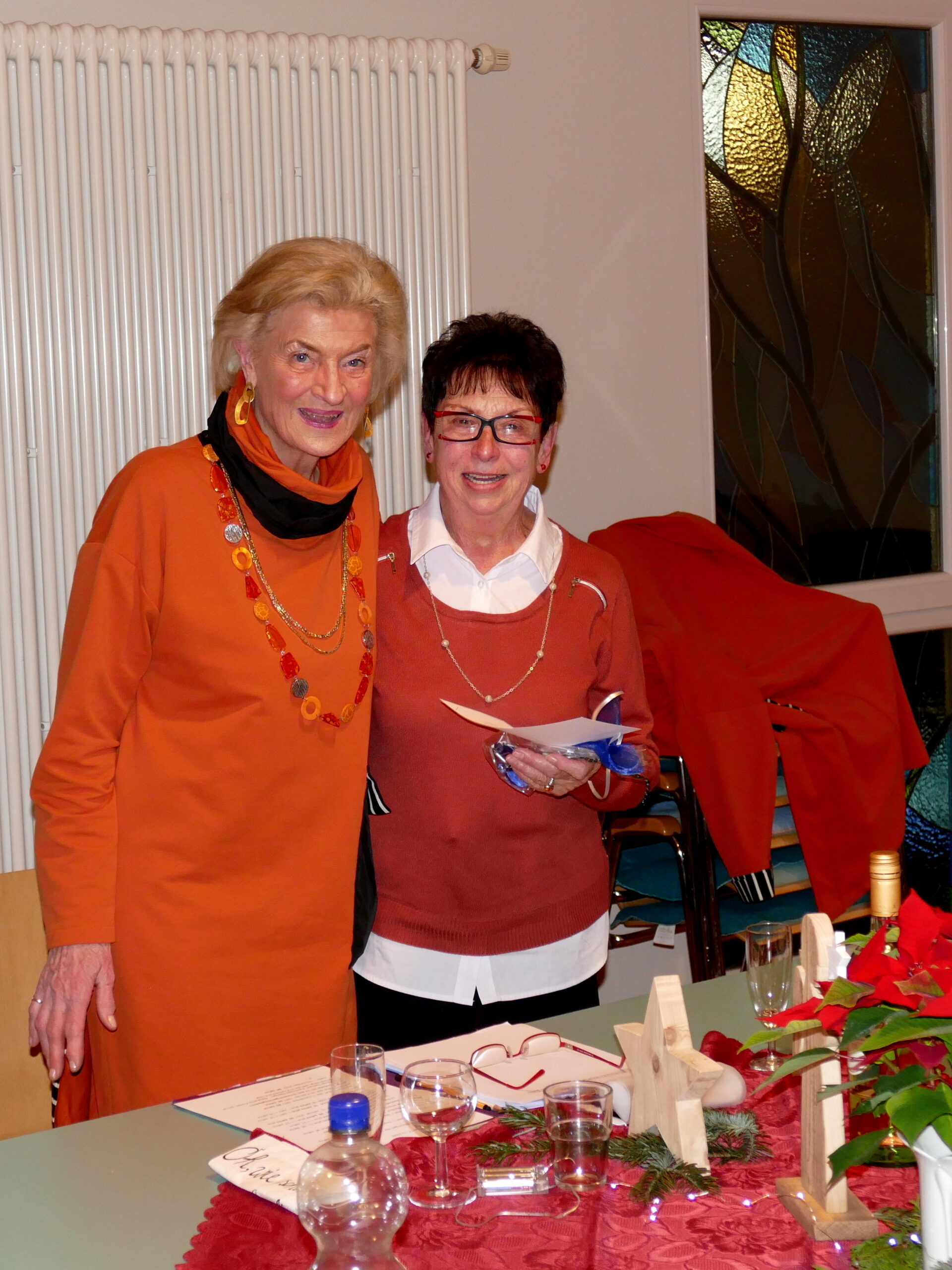 Anschließend fanden Ehrungen für jahrzehntelange Treue und Mitarbeit statt. Dazu gab es jeweils ein kleines modisches Geschenk. Als Gründungsmitglied wurde Reinholde Stenger mit einer Dankurkunde gewürdigt und auch die Vorsitzende selbst konnte auf 20-jährige Mitgliedschaft zurückblicken; die 2. Vorsitzende Erika Hein überreichte die Urkunde und ein Geschenk.